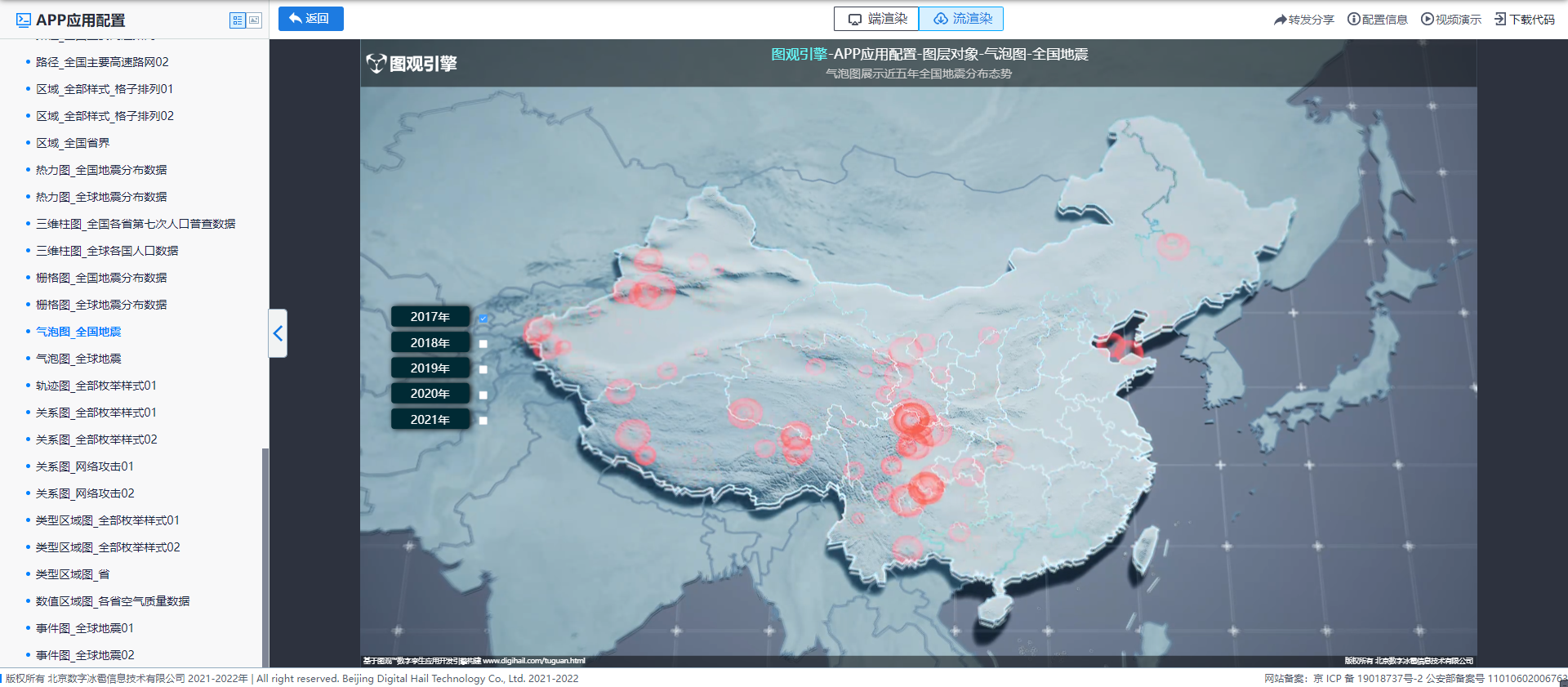 该范例展示了应用编辑器中气泡图的配置方法及效果,范例中气泡图展示近五年全国地震分布态势