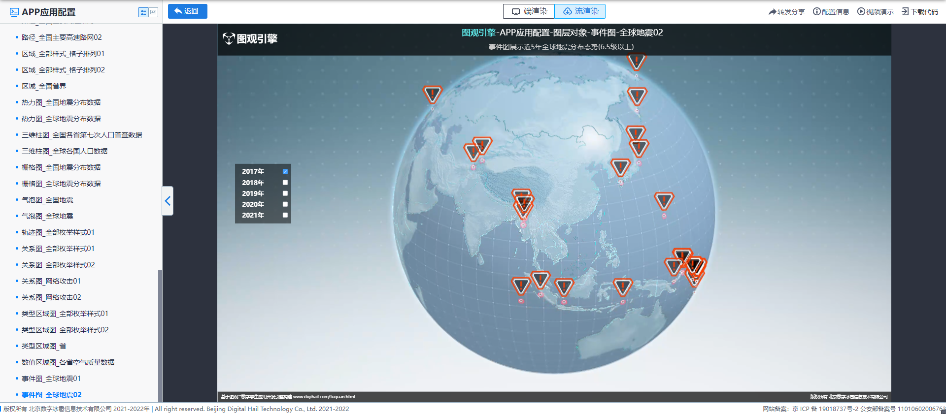该范例展示了应用编辑器中事件图的配置方法及效果,范例中展示全球场景下近五年全球地震分布态势(6.5级以上)