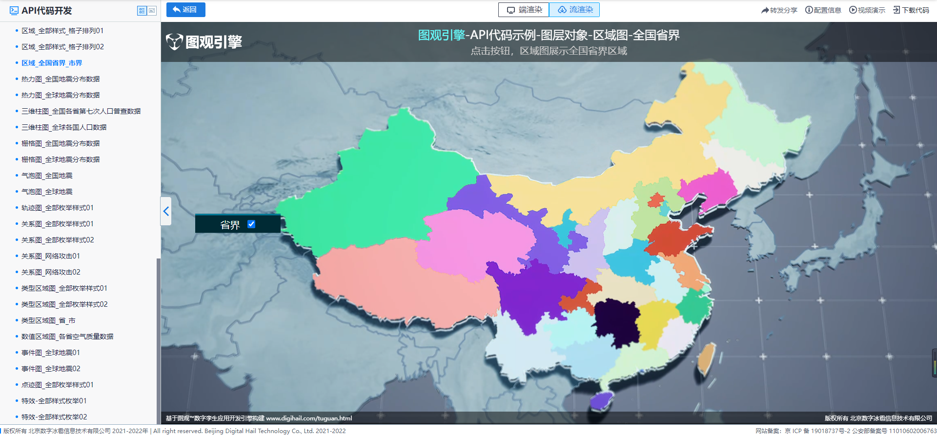 该范例展示了使用图观统一开发API流渲染实现区域的方法及效果,范例中区域图展示全国省界、市界区域。