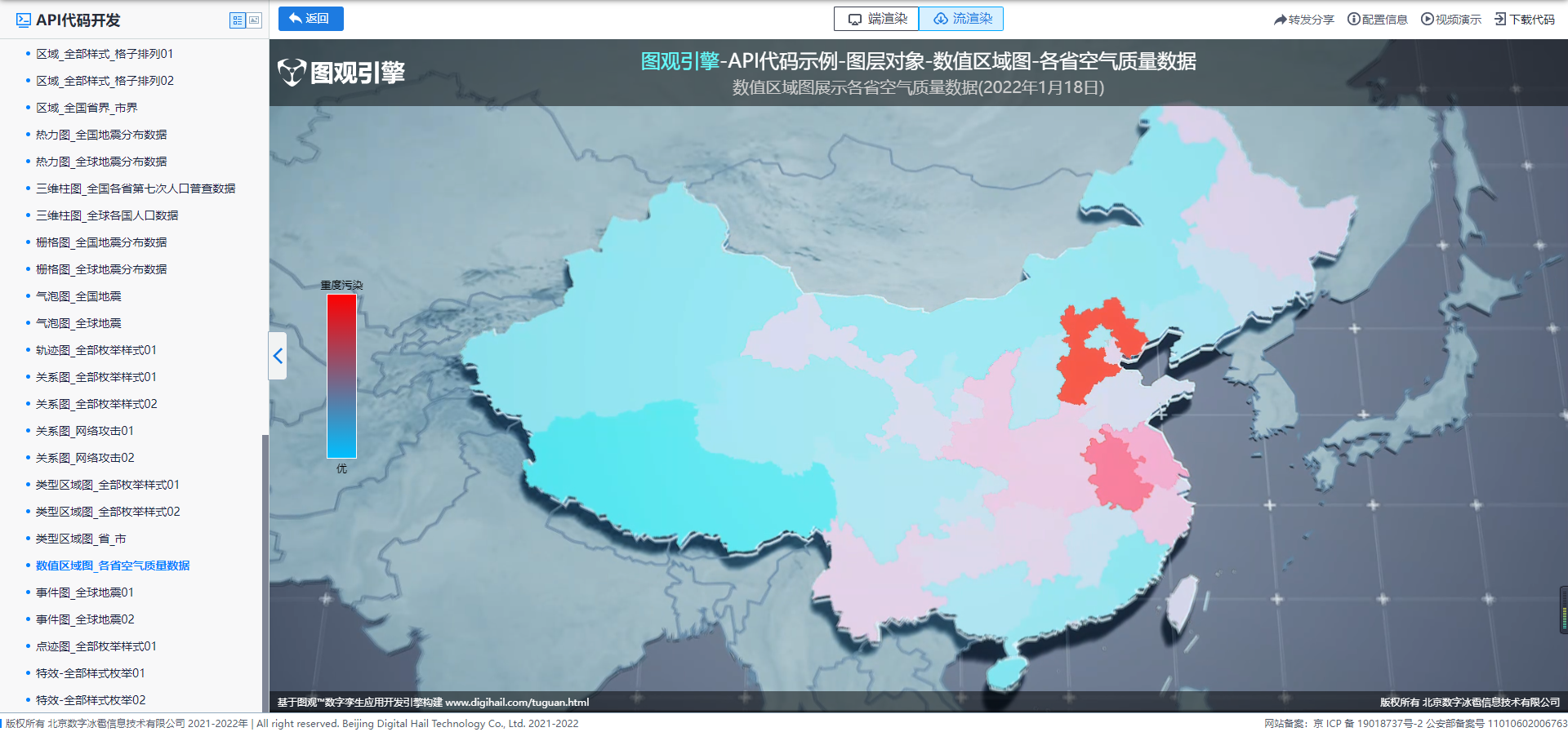 该范例展示了使用图观统一开发API流渲染实现数值区域图的方法及效果,范例中展示各省空气质量数据(2022年1月18日)的数值区域图。