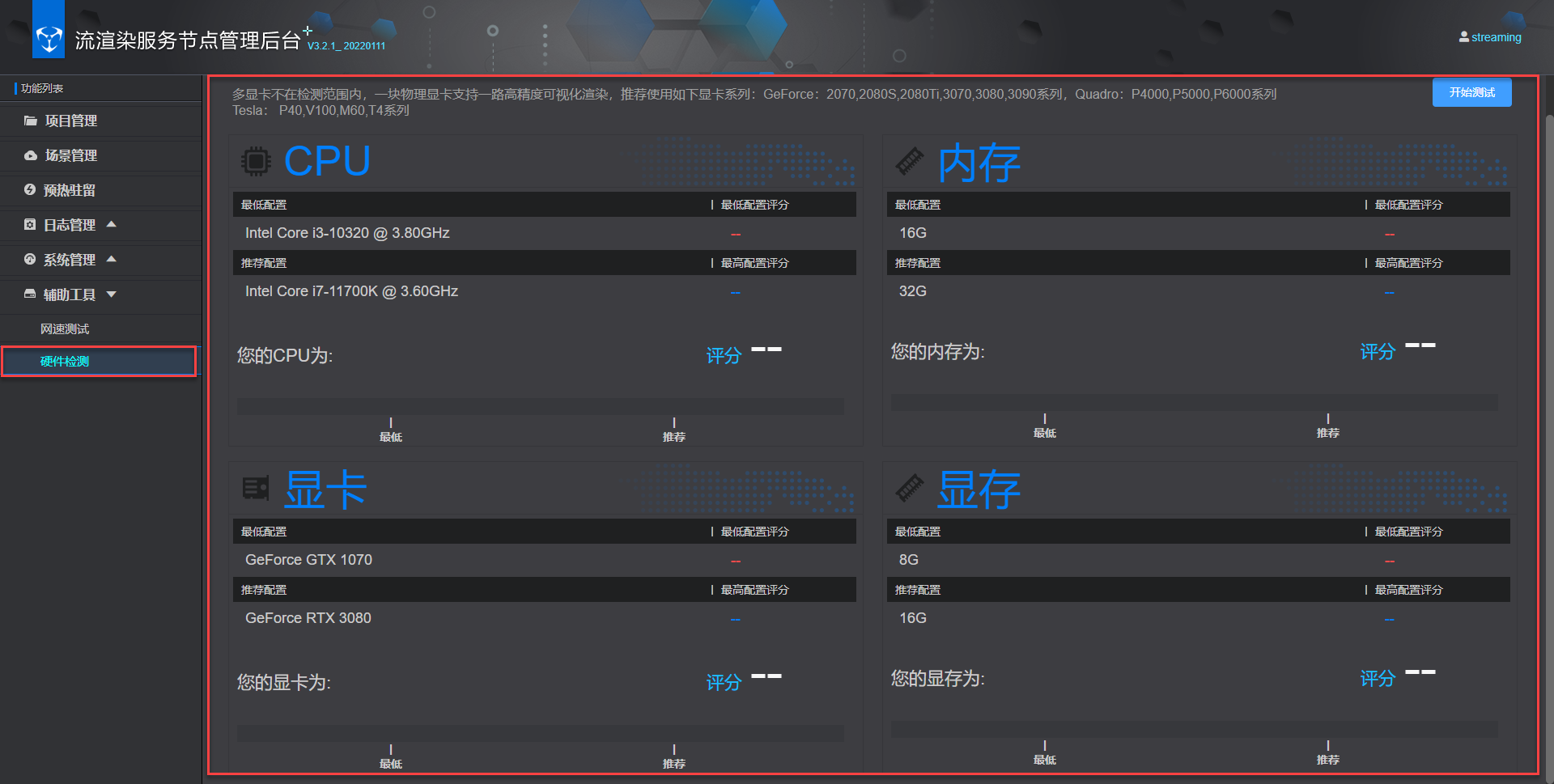 点击硬件检测选项,进入硬件检测功能,如下图: