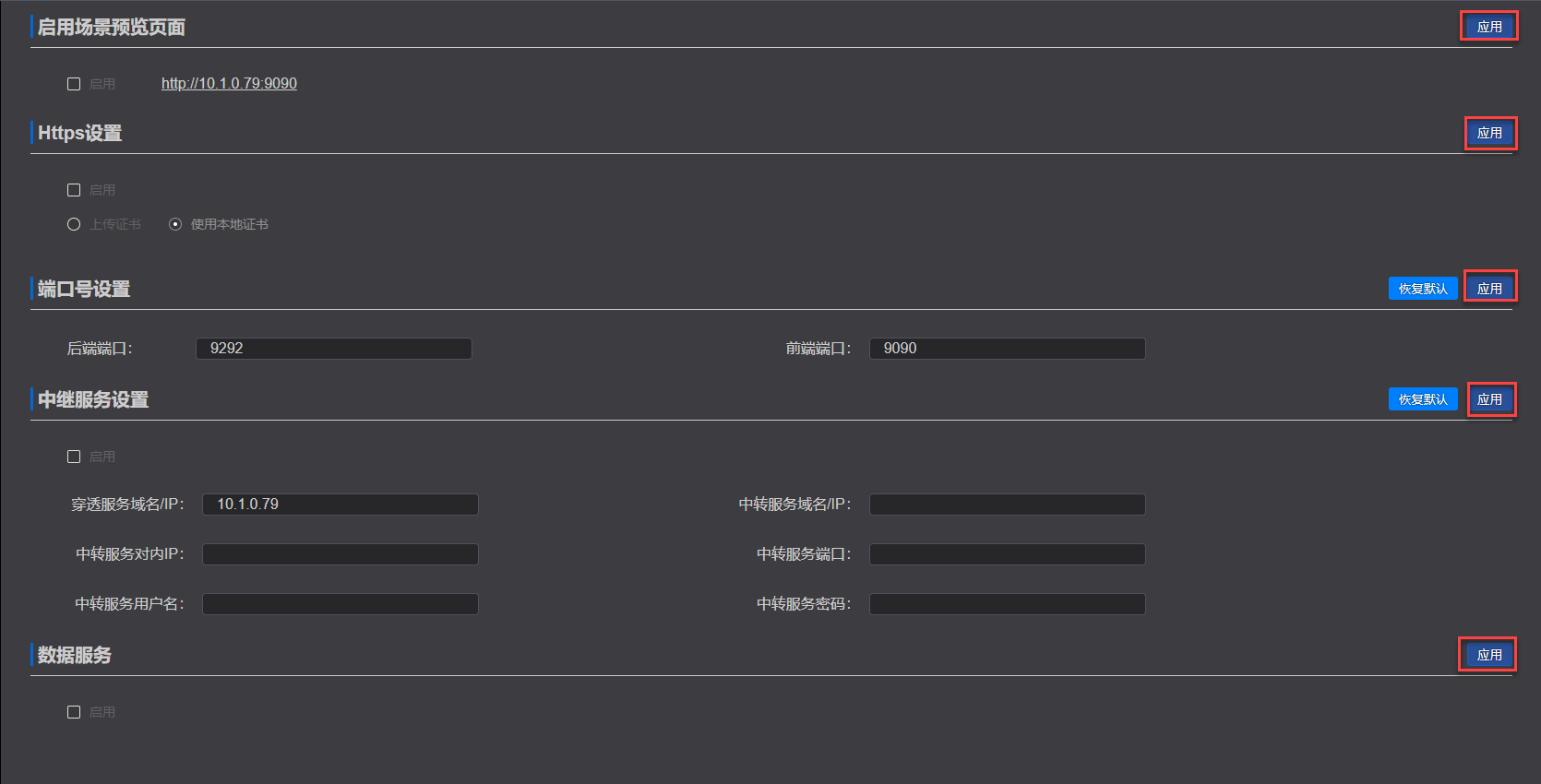 在系统设置界面中,可以应用或取消场景预览页面,应用或取消Https设置、前后端的端口号设置。中继服务的设置、数据服务的功能